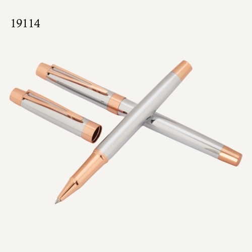 This elegant pen combines a silver-toned body with rose gold accents for a stylish and contemporary look. A perfect balance of sophistication and modern design.