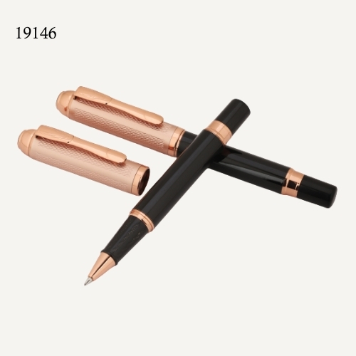 Designed with a textured rose gold cap and sleek black body, this metal pen delivers a modern premium look. Ideal for branding, gifting, and professional use.