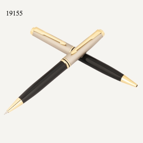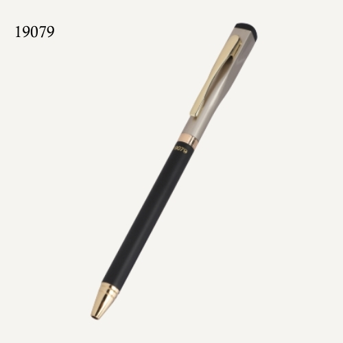 This dual-tone metal pen blends a rich black body with soft gold accents, creating a balanced and elegant professional design. Ideal for business branding and executive use.