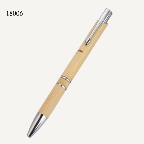 An eco-inspired pen featuring a wooden-texture body with chrome detailing, offering a unique and premium aesthetic.