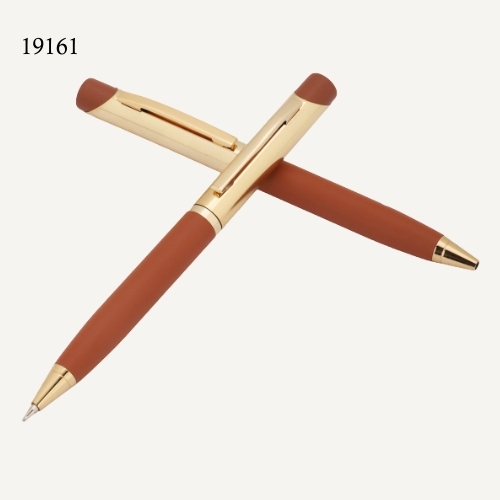 A refined brown matte metal pen enhanced with gold accents for a warm, premium finish. Ideal for executive desks and sophisticated corporate gifting.