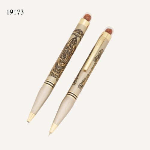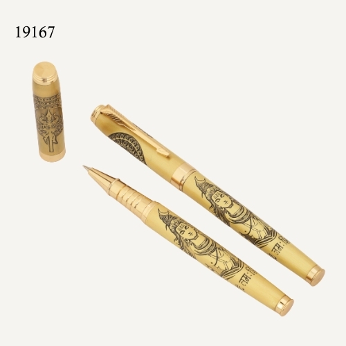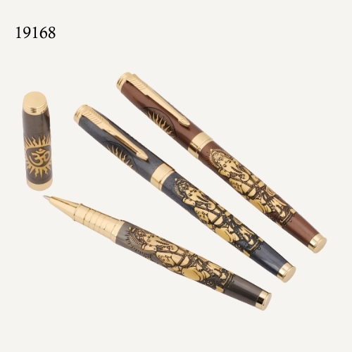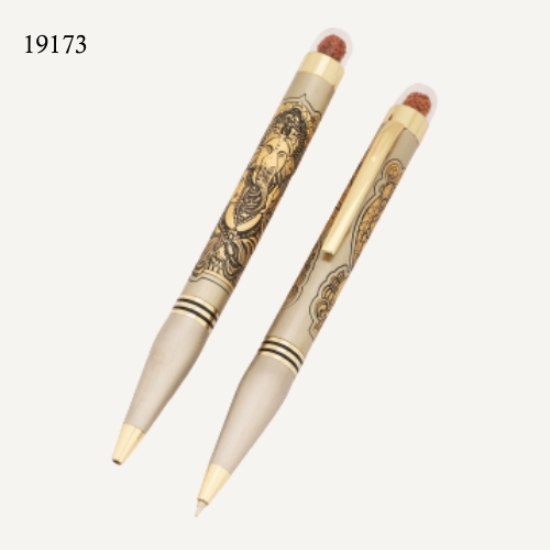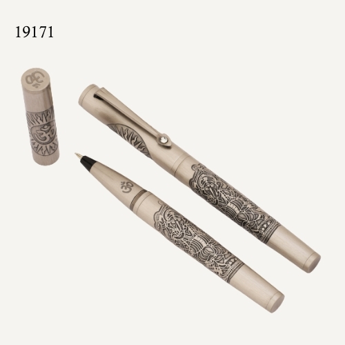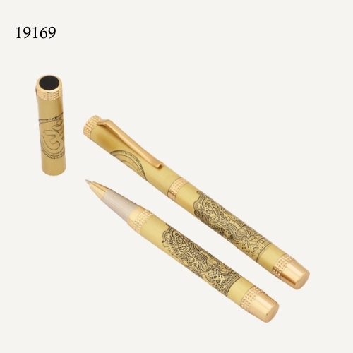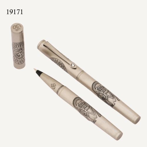 This elegant metal pen showcases an intricate engraving inspired by Ganesh Ji, representing prosperity and success. A refined dual-tone finish makes it suitable for auspicious occasions and luxury gifting.