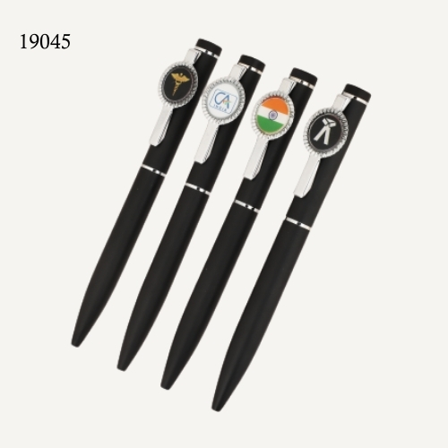 This sleek metal pen stands out with its distinctive emblem clip, adding a unique identity to a classic professional design.